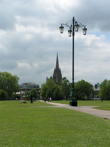This wonderful lamp post, exactly in the middle of the crossing of two paths is in Cambridge, England.
