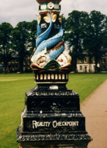 - It may be because the lamp is situated in the middle of two walking paths that intersect. Anyone walking not tuned in to “reality” will likely collide with the lamp, hence “reality checkpoint”.