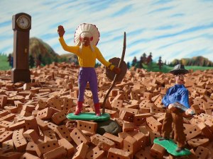 It’s Horse’s (Vincent Patar) birthday and Cowboy (Stéphane Aubier) and Indian (Bruce Ellison) completely forgot to buy him a present. So they quickly order 50 bricks over the internet to build him a barbecue grill in the garden. Unfortunately, due to a slight typing accident, they order 50 million bricks instead. Ultimately, this leads to the destruction of their house and a trip basically around the world for the three of them.
