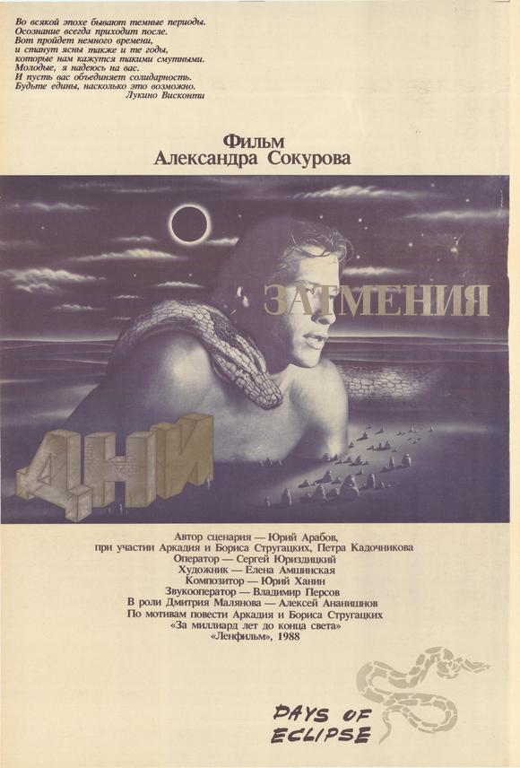 Dni zatmeniya is Aleksandr Sokurov‘s loose adaptation of Arkady and Boris Strugatsky‘s novel Definitely Maybe, starring Aleksei Ananishnov, Eskender Umarov and Vladimir Zamansky.