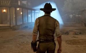 Jake Lonergan (Daniel Craig) wakes up in the desert, without his memories but with a weird bracelet on his arm that he isn’t able to remove. He makes his way to the town of Absolution where he is recognised as a wanted fugitive when he gives Percy (Paul Dano), the son of the local head honcho Woodrow Dolarhyde (Harrison Ford), his due. Before things can go really bad, Absolution is attacked by space ships and many of the town inhabitants are abducted, among them Percy and the town’s barkeeper Doc’s (Sam Rockwell) wife. That’s when Jake’s bracelet kicks into action and shows some really special features. So, a search party heads out to find the missing people, including Jake, Woodrow, Doc and the mysterious Ella (Olivia Wilde).