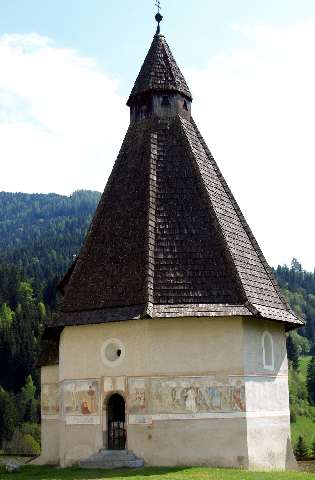 I was visiting L. in Carinthia when I saw a sign for this museum and I was just really stumped: What the hell is a “Death Dance Museum” anyway. L. explained and we decided to see if it was open while I was there and if so, to go there for a visit. And we were in luck – they were open Sunday morning between 10 and 12. We arrived there shortly before ten and first looked at the outside of the ossuary and the copies of the paintings – accompanied by the church choir: mass was in full pentecoast mode next door.