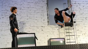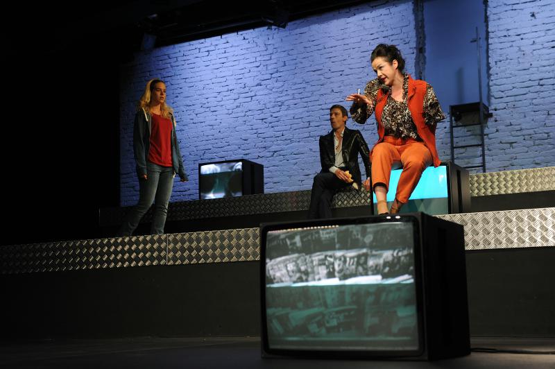 But despite that the play never really got off the ground. And I blame the production for that. The stage design – consisting only of three platforms and a few old TVs (that consistently showed black and white images, sometimes CCTV images, sometimes only interference) in front of a white brick wall with a door – was extremely boring and felt too stale and disconnected from the play.