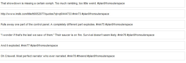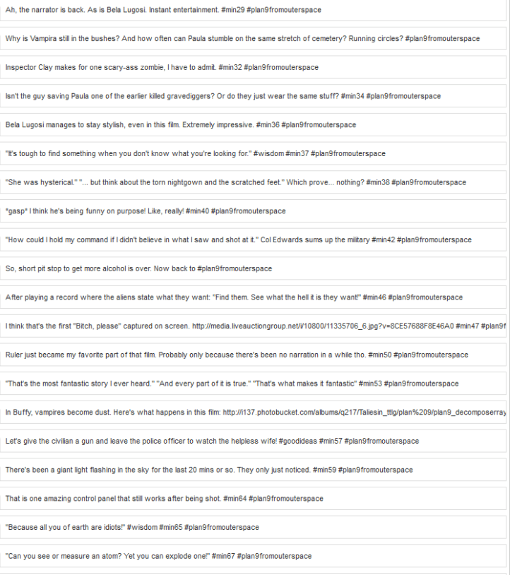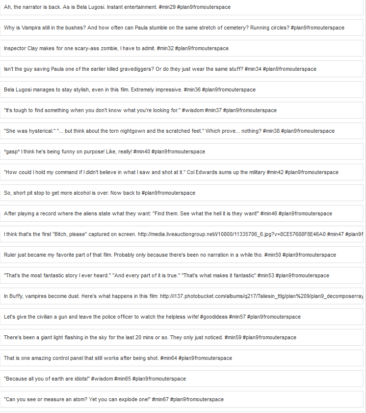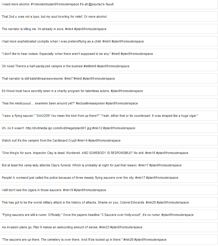 Plan 9 from Outer Space is absolutely insane. It is a movie that has to be experienced and is hard to review. Which is why I did a tweet-along – you can find it below.