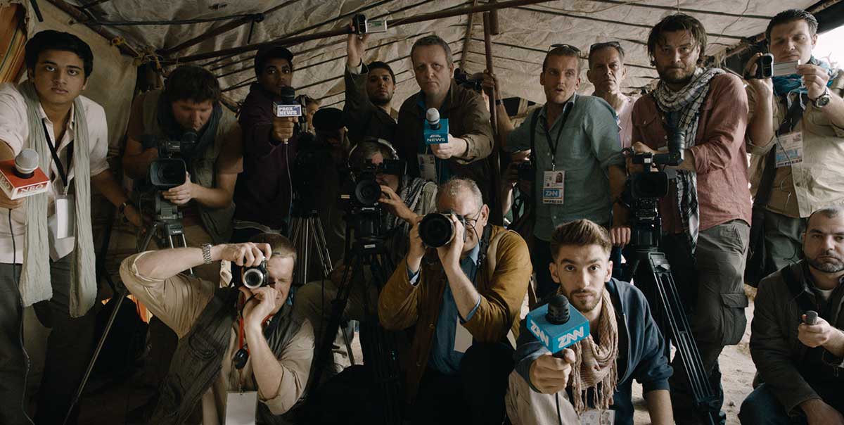 That is an interesting point to make, especially because Eder embeds it in images of mass-produced news. Edwin’s editor sends him to Afghanistan as the one thousand and first reporter because that stuff sells. Cal is taken on a specially organized press tour where all news outlets are fed the news of the day, the same – clearly scripted – interview with the same family. Lana is one of many correspondents standing in a row reporting the same story at the same time. The camera pans over the hotel where all the journalists are staying and we can see that there is one standing on each balcony in the same position, sending off the same news to their respective channel. When all the reporting is the same, it makes the constant traumatization of all those journalists even more questionable.