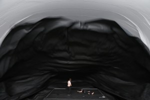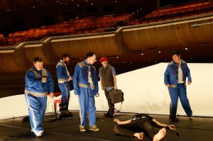 Plus, it was such an unusual setup for the play: the audience gets led into the backstage area and there on the stage itself (through a dark and narrow entrance, very Freudian), where the chairs are set facing the audience room. Only that there is a huge black tent, preventing us from seeing. In one of the best moments, that black tent falls to reveal a white tent (let there be light), and later the white tent falls as well to reveal the audience room where the actors are cleaning up after creation, life and death. Placing the audience on stage and the actors as cleaners is not only an interesting comment on theater itself, but also the role of disabled people in our society.