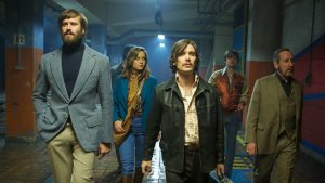 Bernie (Enzo Cilento) and his brother Stevo (Sam Riley) are meeting with IRA guys Chris (Cillian Murphy) and Frank (Michael Smiley) and their American contact Justine (Brie Larson). They are preparing for a weapons deal mediated by Ord (Armie Hammer) who got them in touch with South African arms dealer Vernon (Sharlto Copley) and his group – Martin (Babou Ceesay), Harry (Jack Reynor) and Gordon (Noah Taylor). But things quickly go sideways and turn very bloody.