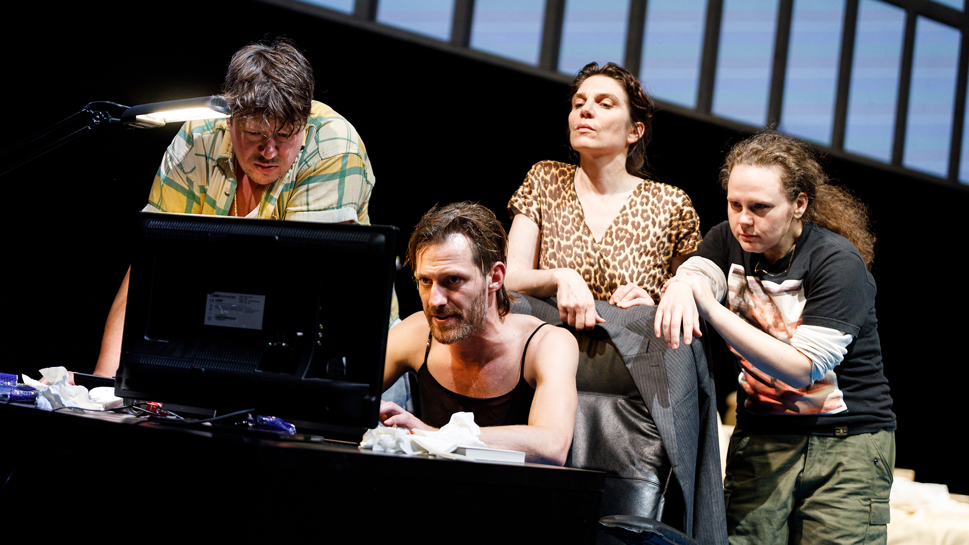 Those four actors basically narrate the text pretty much word for word (albeit shortened). This was one of the more difficult parts of the production for me. Instead of narrating, they could have made more of a story of it – especially the autofictional parts would have been rather easily turned into a story. In addition to the foursome, we get a fifth actor (Lara Sienczak) who only appears on screen and gives us a very boiled down version of the theoretical chapters. This way of delivering the text is very true to the form of the book that is written in a fast-firing stream of consciousness, but it’s also incredibly hard to take in when you’re in the audience and I felt my attention drifting more than I wanted to.