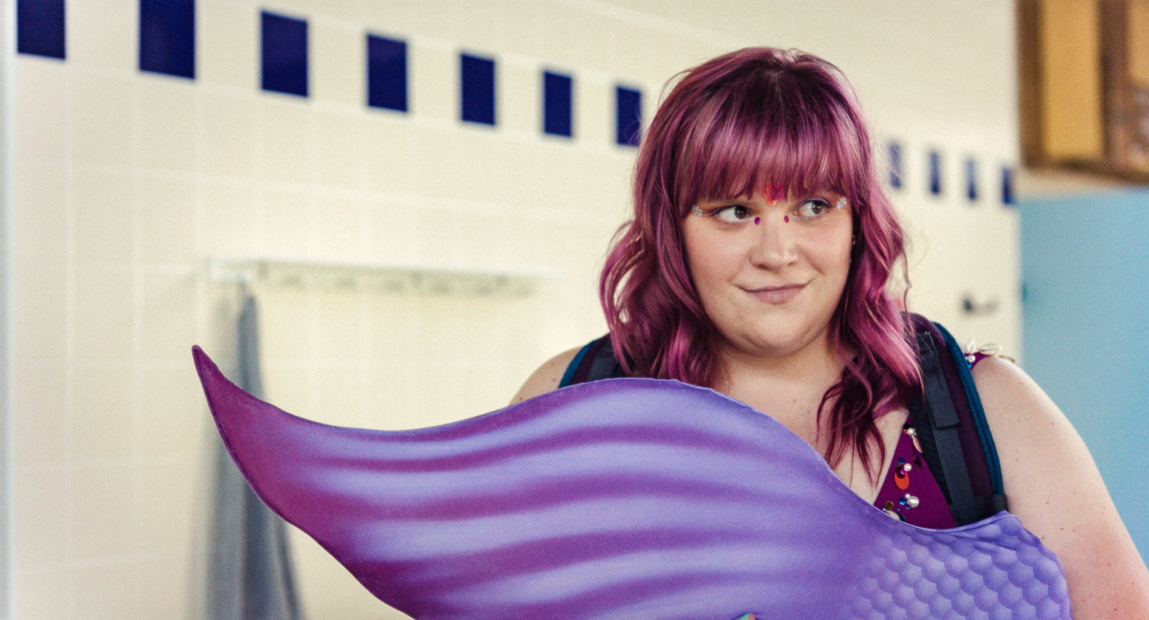 Annika (Stefanie Reinsperger) works as a supermarket cashier together with her best friend Karo (Julia Franz Richter). The job is dreary and constantly threatened by her boss Mrs Biber (Inga Busch). At home, things aren’t really better as Annika lives with her alcoholic father Hermann (Karl Fischer) who pretends to be disabled. It’s only at the swimming pool that Annika can relax. There, she wears a mermaid tale, flirts with Marc (Nico Ehrenteit), and all is well. She dreams of owning a special tailor-made tail, but can’t really afford it. Still, she could try.